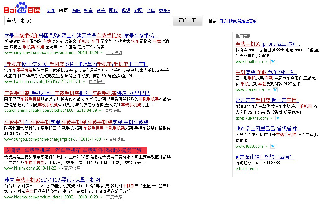 在搜索结果约为14,100,000中排名第三页第五位。您可以在这里点击 "车载手机架"查看;