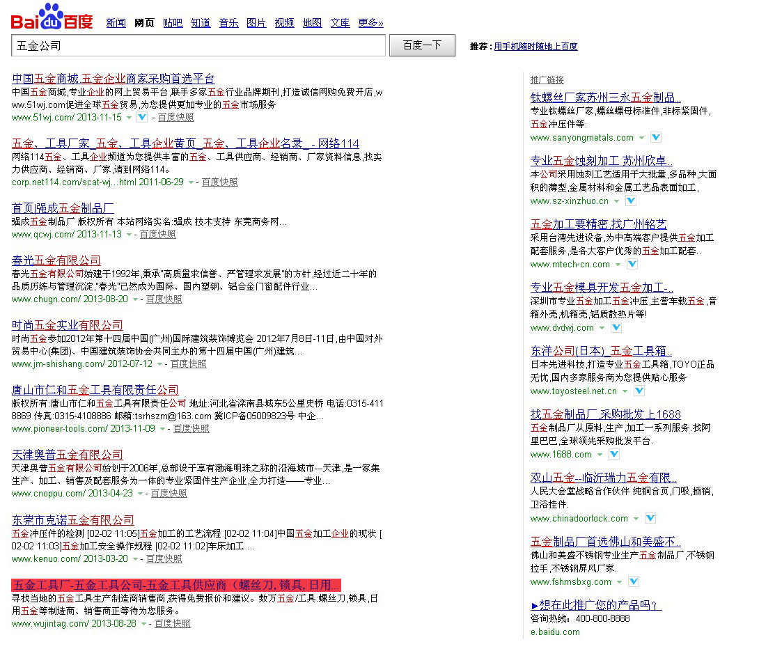 在搜索结果约为81,300,000中排名第三页第九位。您可以在这里点击 "五金公司"查看;