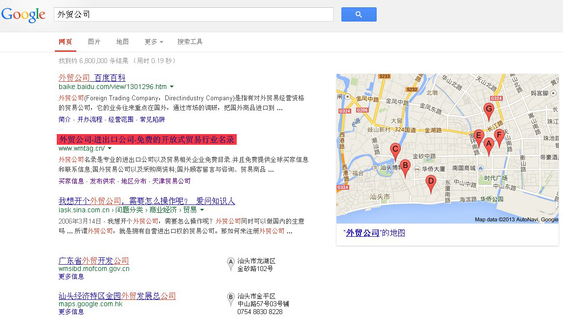 在搜索结果约为6,800,000 中排名第二位。您可以在这里点击 "外贸公司"查看;